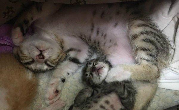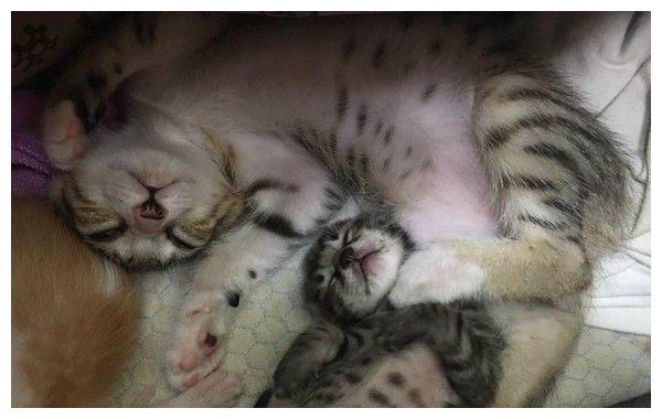 虎斑猫从小睡姿超奔放 带坏中途幼猫 同步翻肚 超