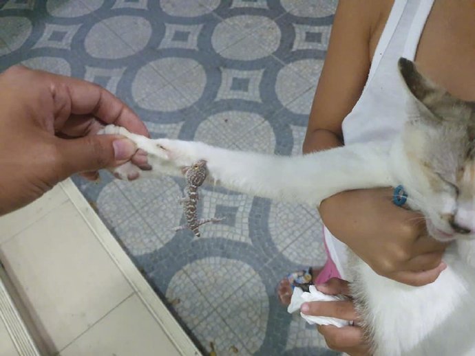 猫手被小蜥蜴咬住 它躺在小女孩怀里不敢动 喵 铲屎的