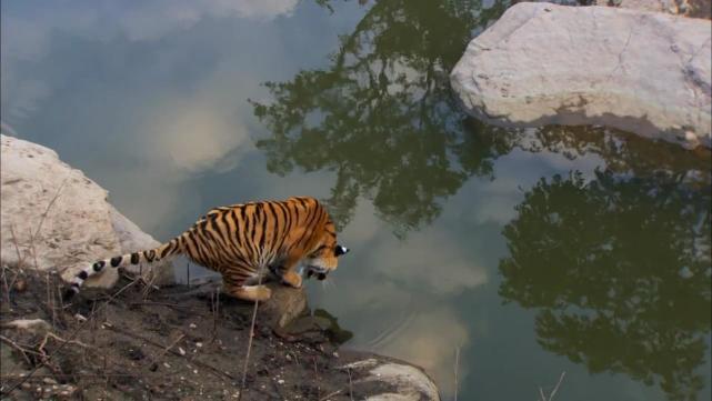 老虎认识自己的影子 一只孟加拉虎过河时被自己倒影吓得夺路而逃